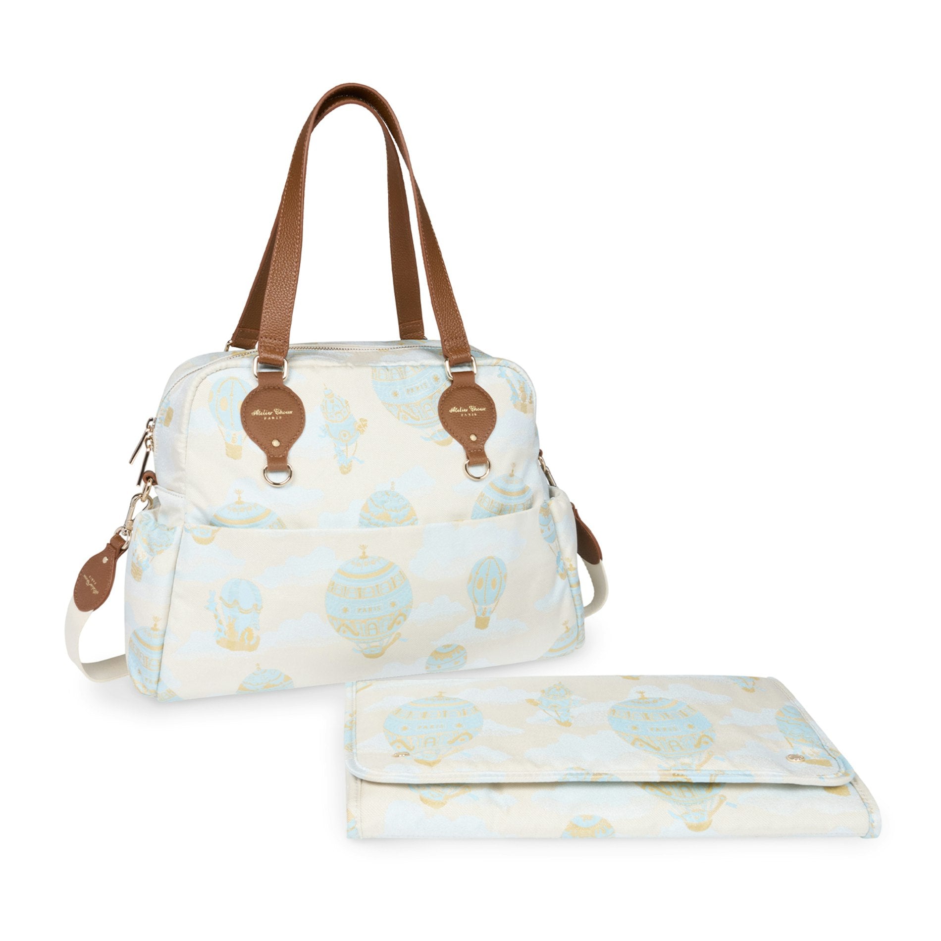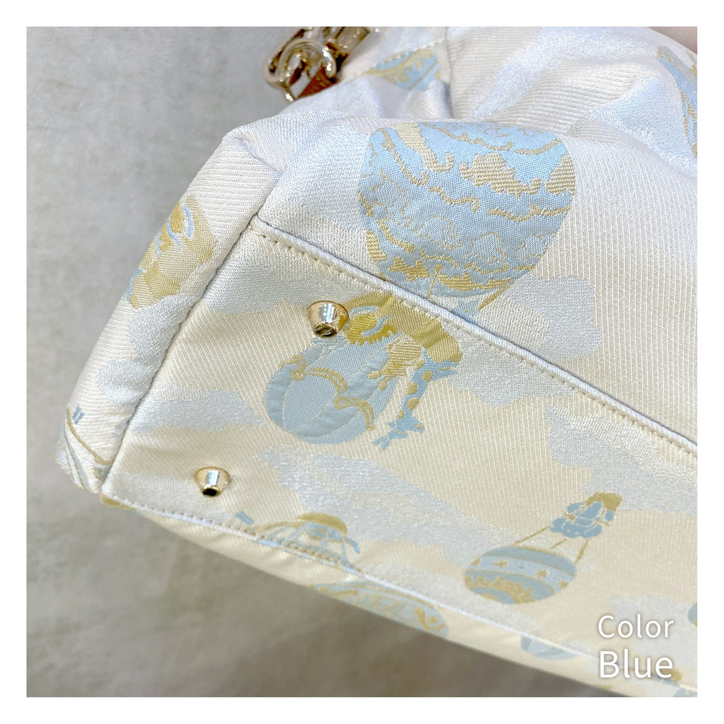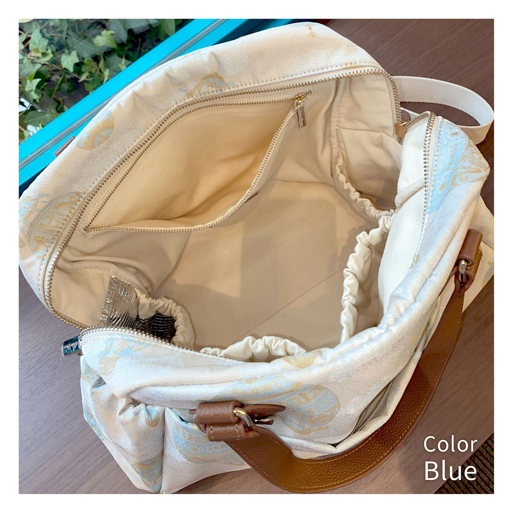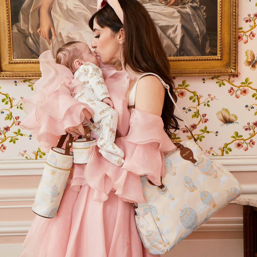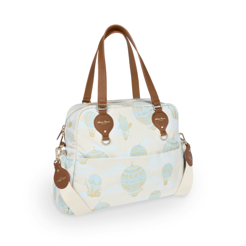 Atelier Choux のシンボルである『熱気球』を美しく繊細なジャカード生地にあしらったマザーズバッグ。レザーパーツにも熱気球のモチーフを取り入れ、刻印入りのブランドロゴが上品なアクセントになっています。外側や内側にたくさんのポケットがあり、赤ちゃんのおもちゃやお世話グッズもスッキリと収納できます。取り外し可能なショルダーストラップやお揃い柄の折りたたみ式おむつ替えマットも付いた、ラグジュアリーなマザーズバッグです。