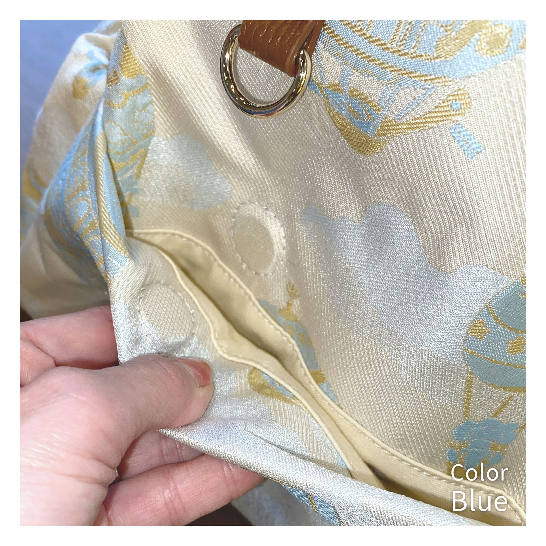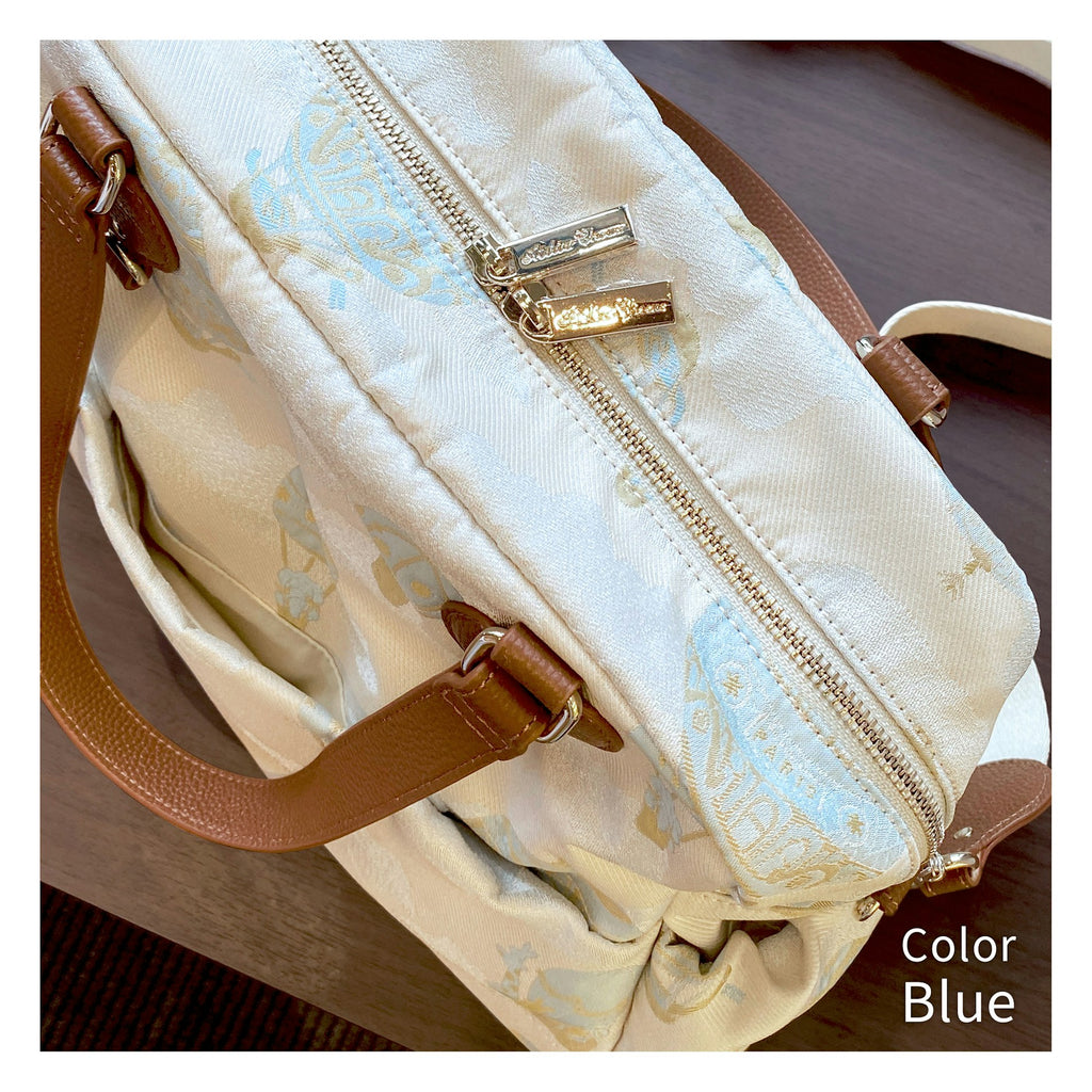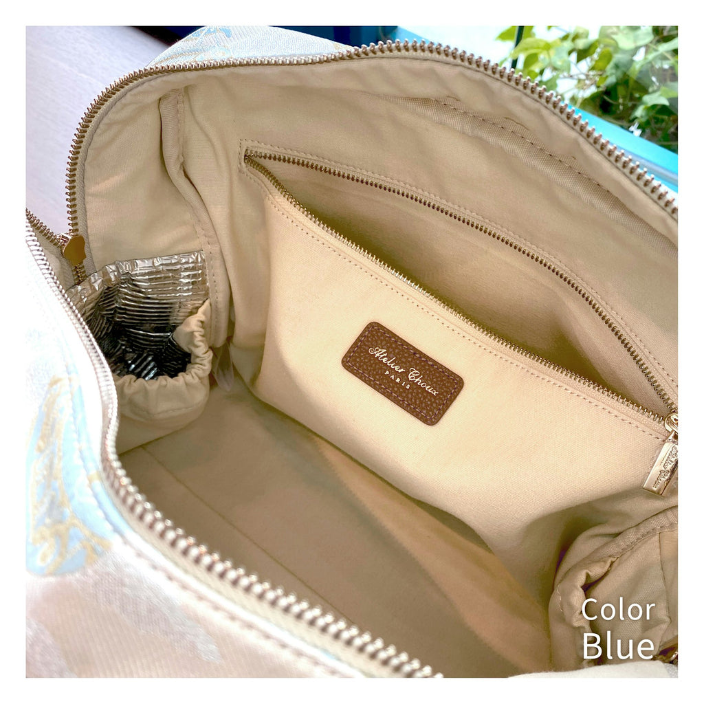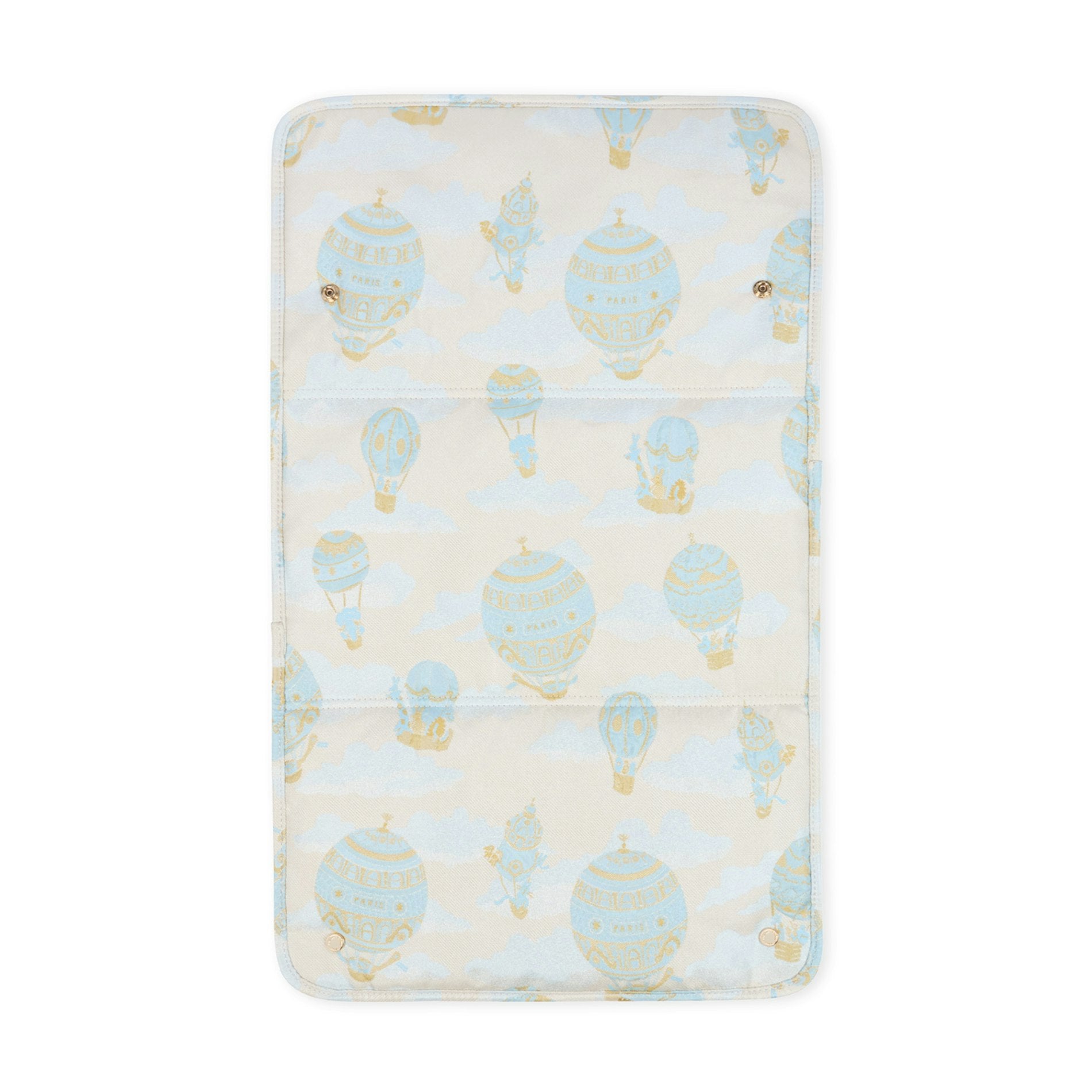 Atelier Choux のシンボルである『熱気球』を美しく繊細なジャカード生地にあしらったマザーズバッグ。レザーパーツにも熱気球のモチーフを取り入れ、刻印入りのブランドロゴが上品なアクセントになっています。外側や内側にたくさんのポケットがあり、赤ちゃんのおもちゃやお世話グッズもスッキリと収納できます。取り外し可能なショルダーストラップやお揃い柄の折りたたみ式おむつ替えマットも付いた、ラグジュアリーなマザーズバッグです。