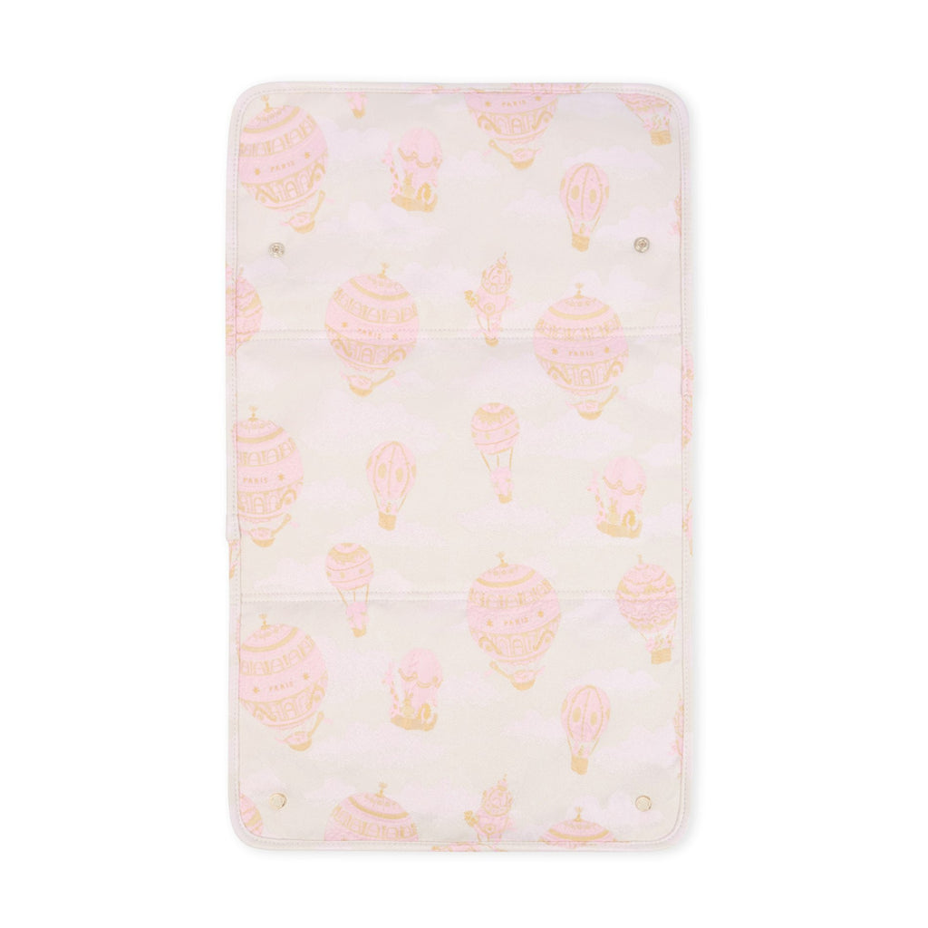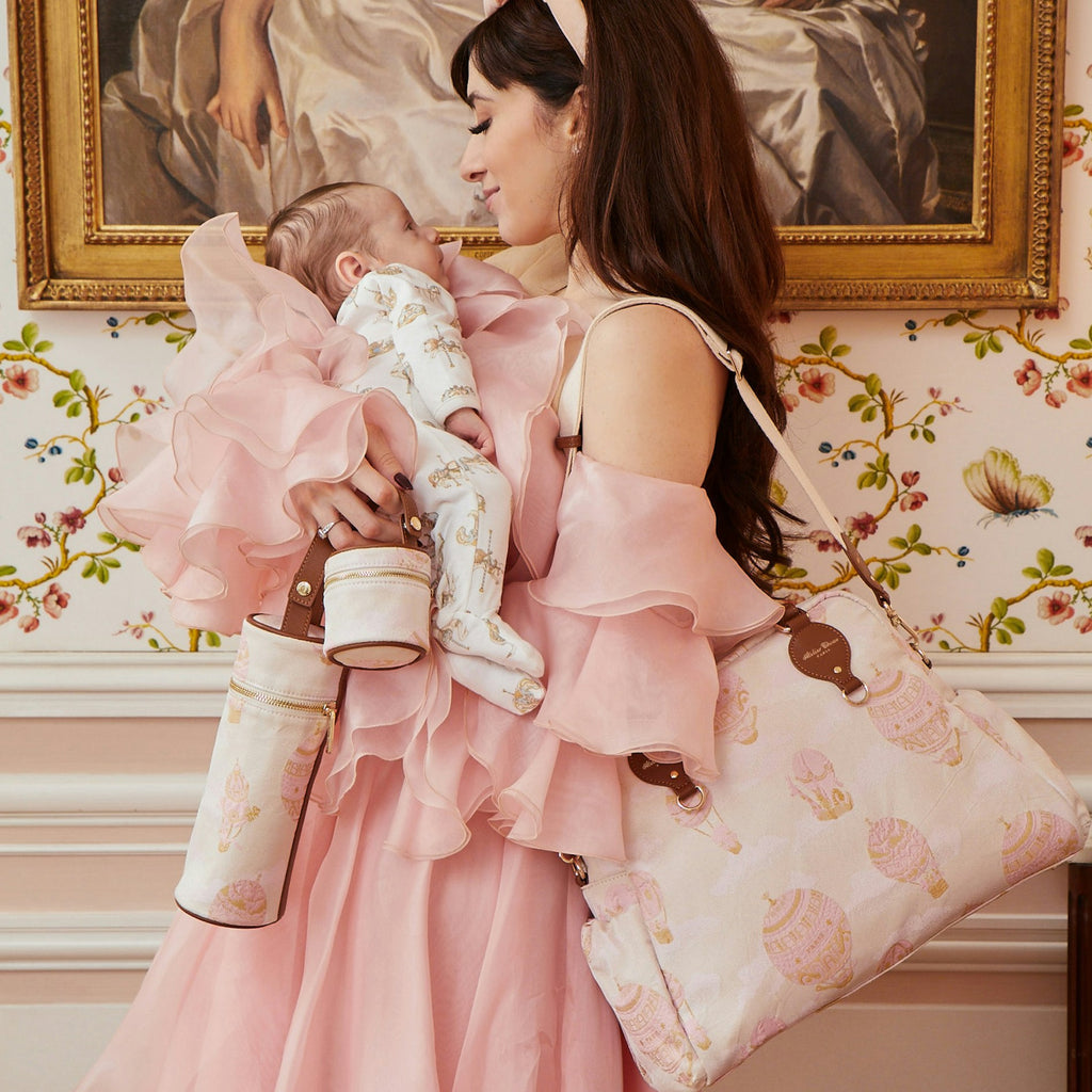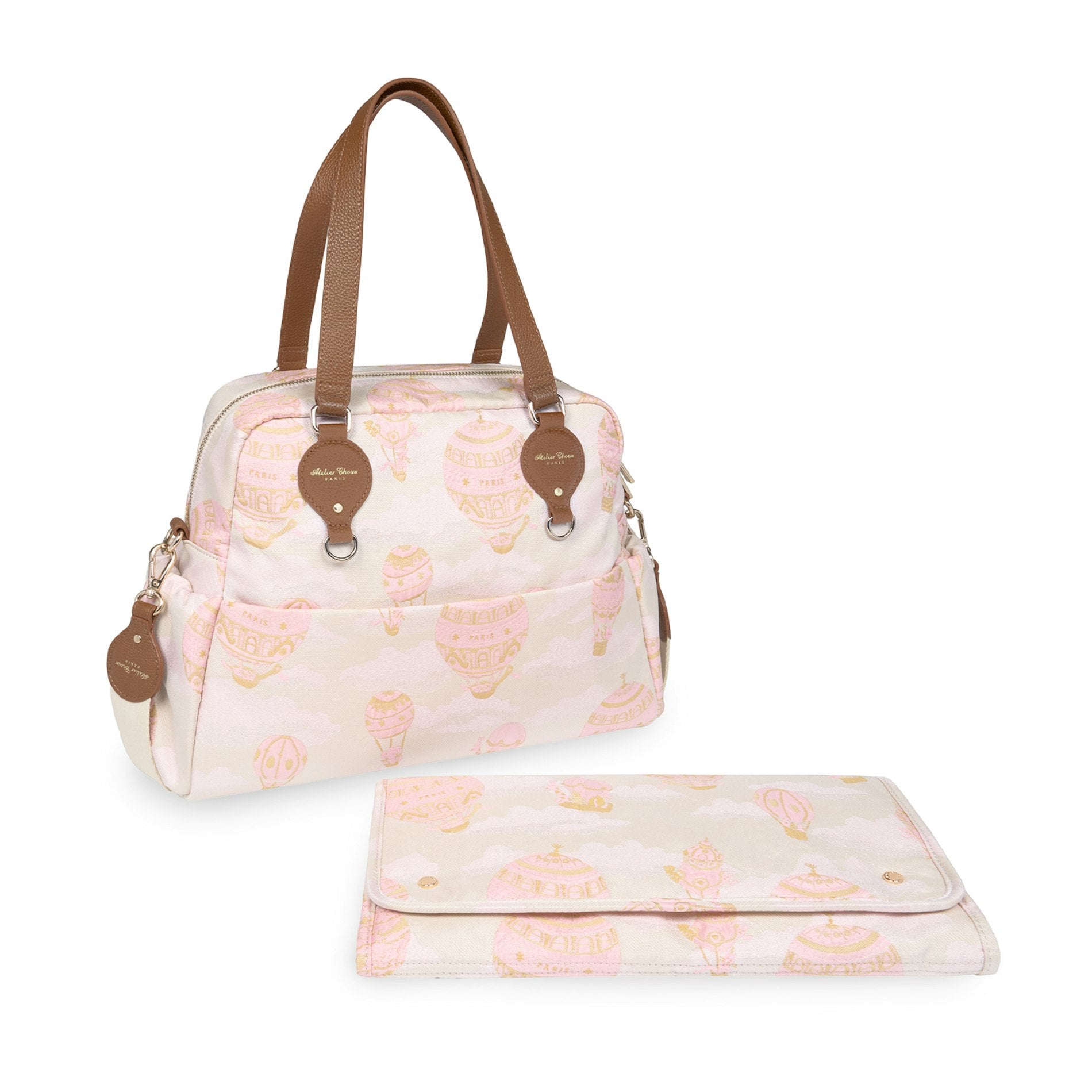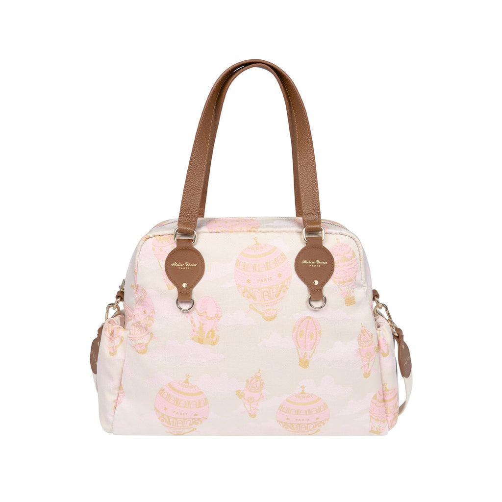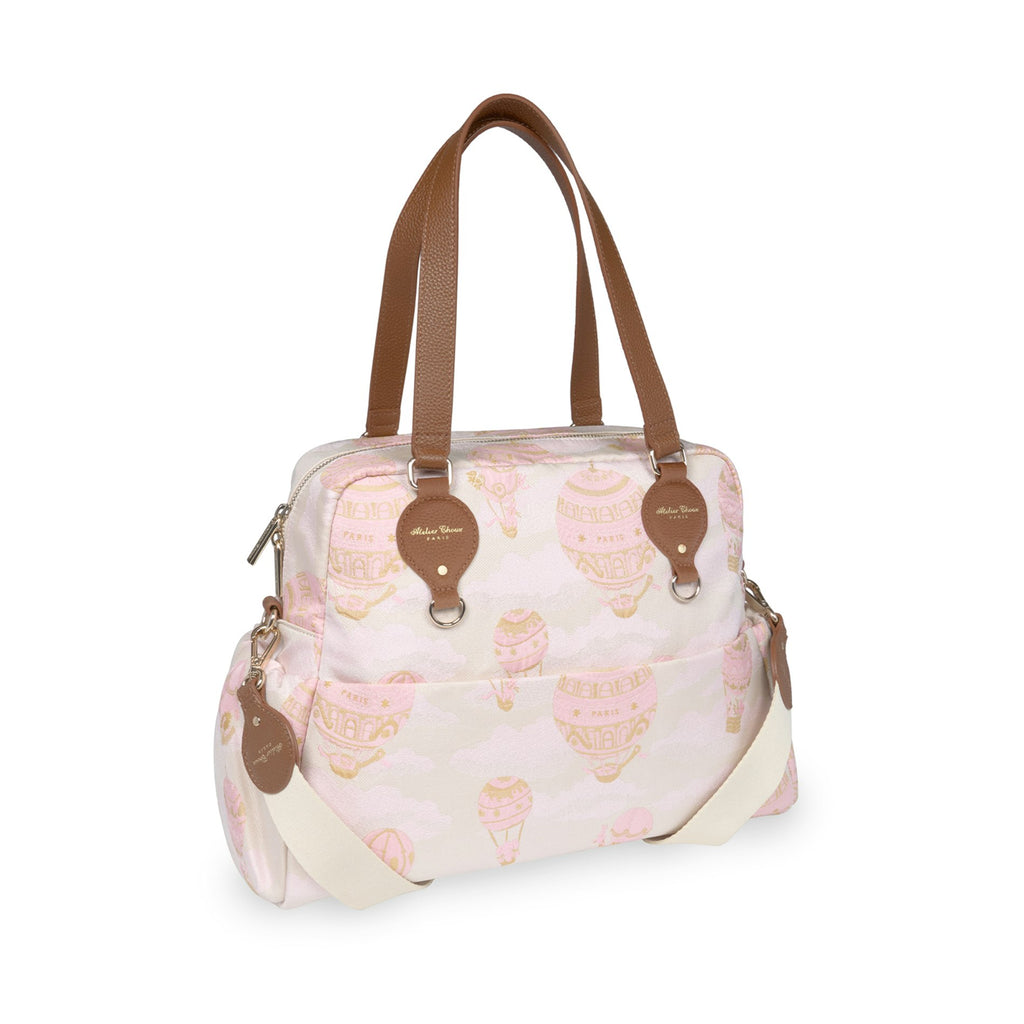 Atelier Choux のシンボルである『熱気球』を美しく繊細なジャカード生地にあしらったマザーズバッグ。レザーパーツにも熱気球のモチーフを取り入れ、刻印入りのブランドロゴが上品なアクセントになっています。外側や内側にたくさんのポケットがあり、赤ちゃんのおもちゃやお世話グッズもスッキリと収納できます。取り外し可能なショルダーストラップやお揃い柄の折りたたみ式おむつ替えマットも付いた、ラグジュアリーなマザーズバッグです。