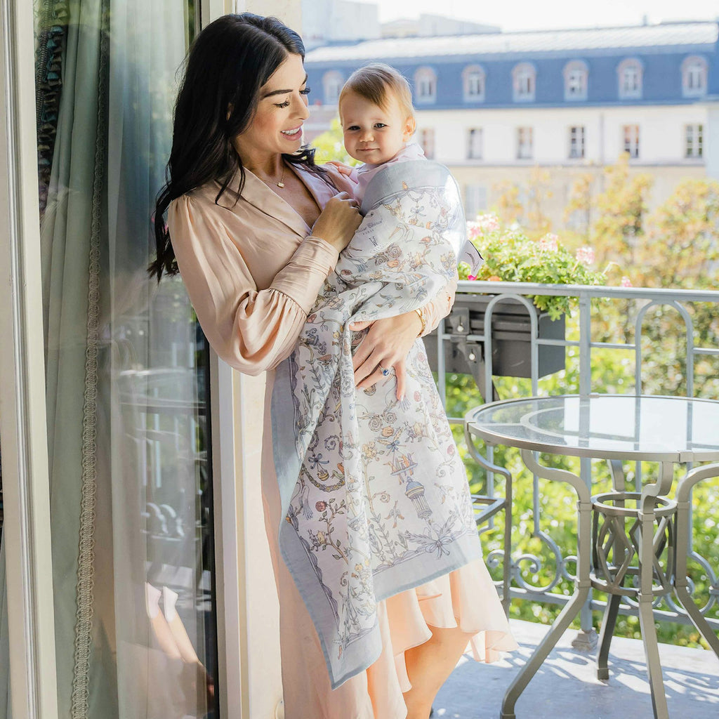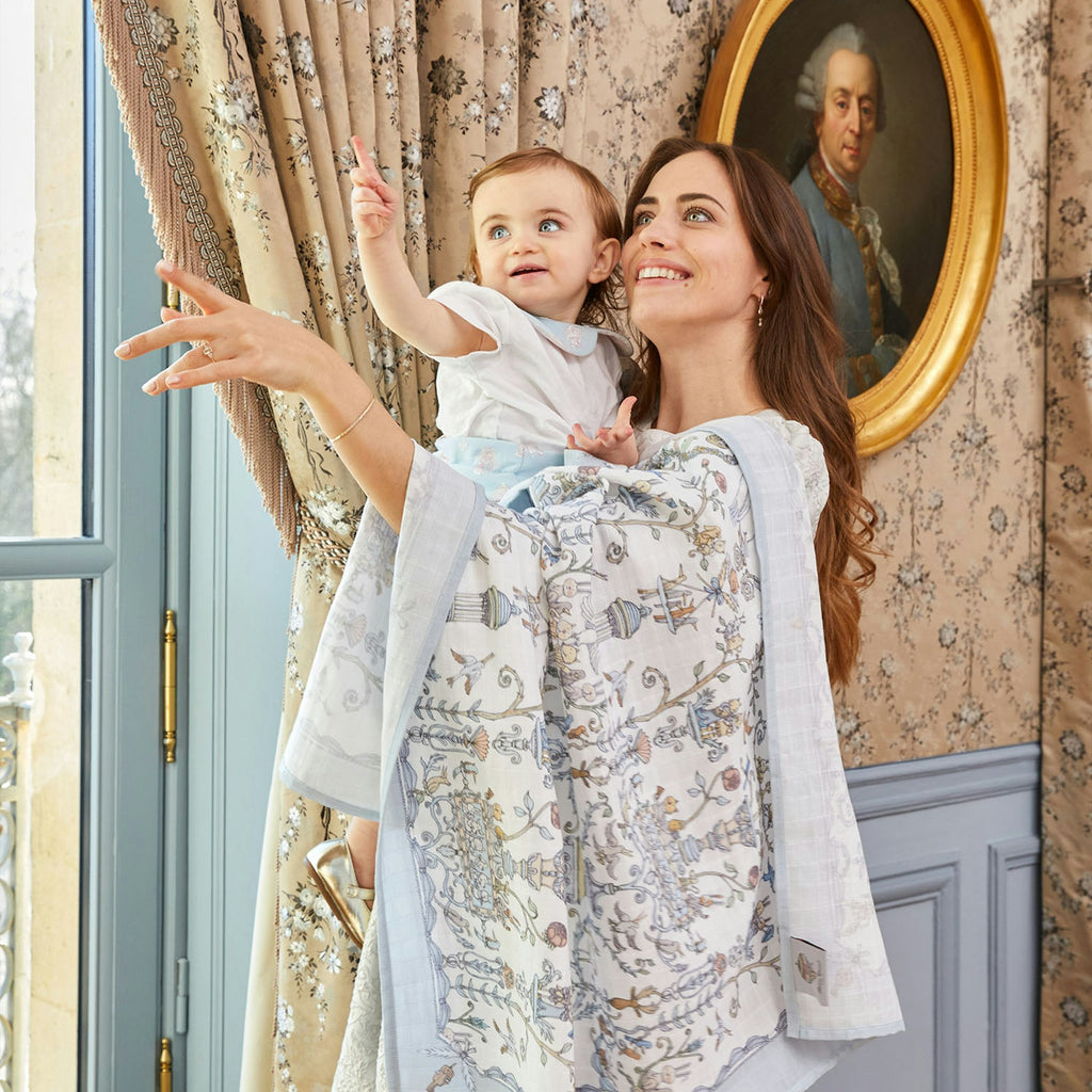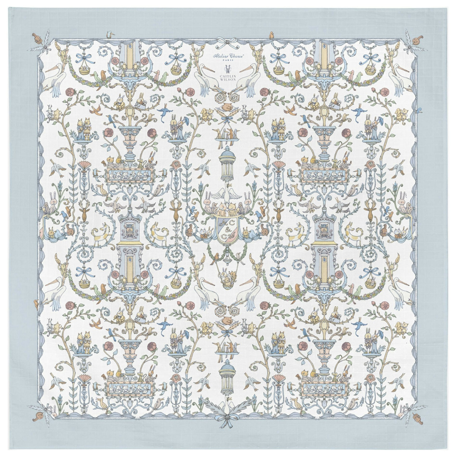 100cm×100cmの正方形いっぱいに描かれるイラストは、18世紀フランスのテキスタイル伝統に着想を得た、伝統と幻想が優雅に融合したデザイン。赤ちゃんの感性を豊かに育みます。