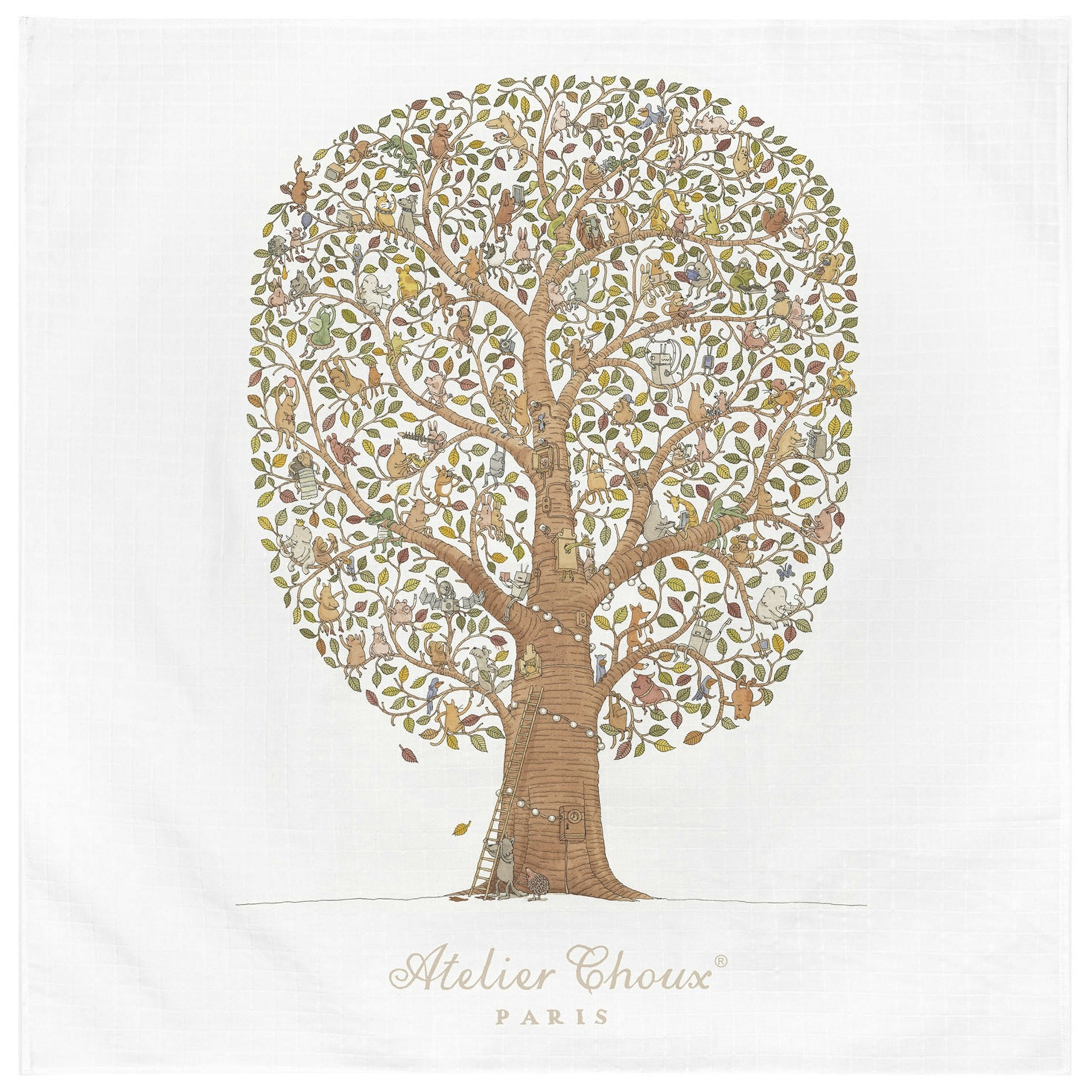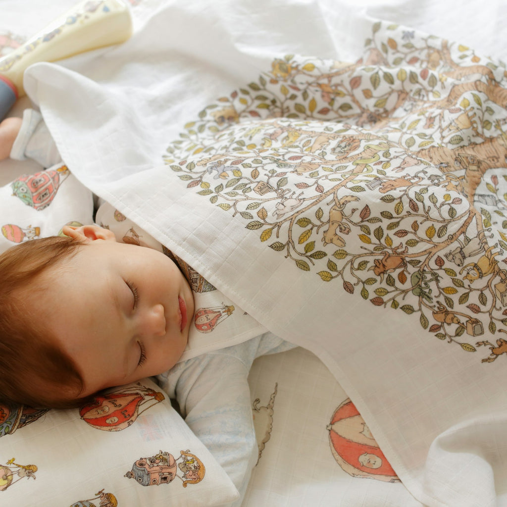 The illustration, spanning the entire 100cm x 100cm square, depicts a large, thriving tree. Humorous animals relax on its many branches and leaves. The small stories woven by each animal bring gentle smiles to your baby's everyday life.