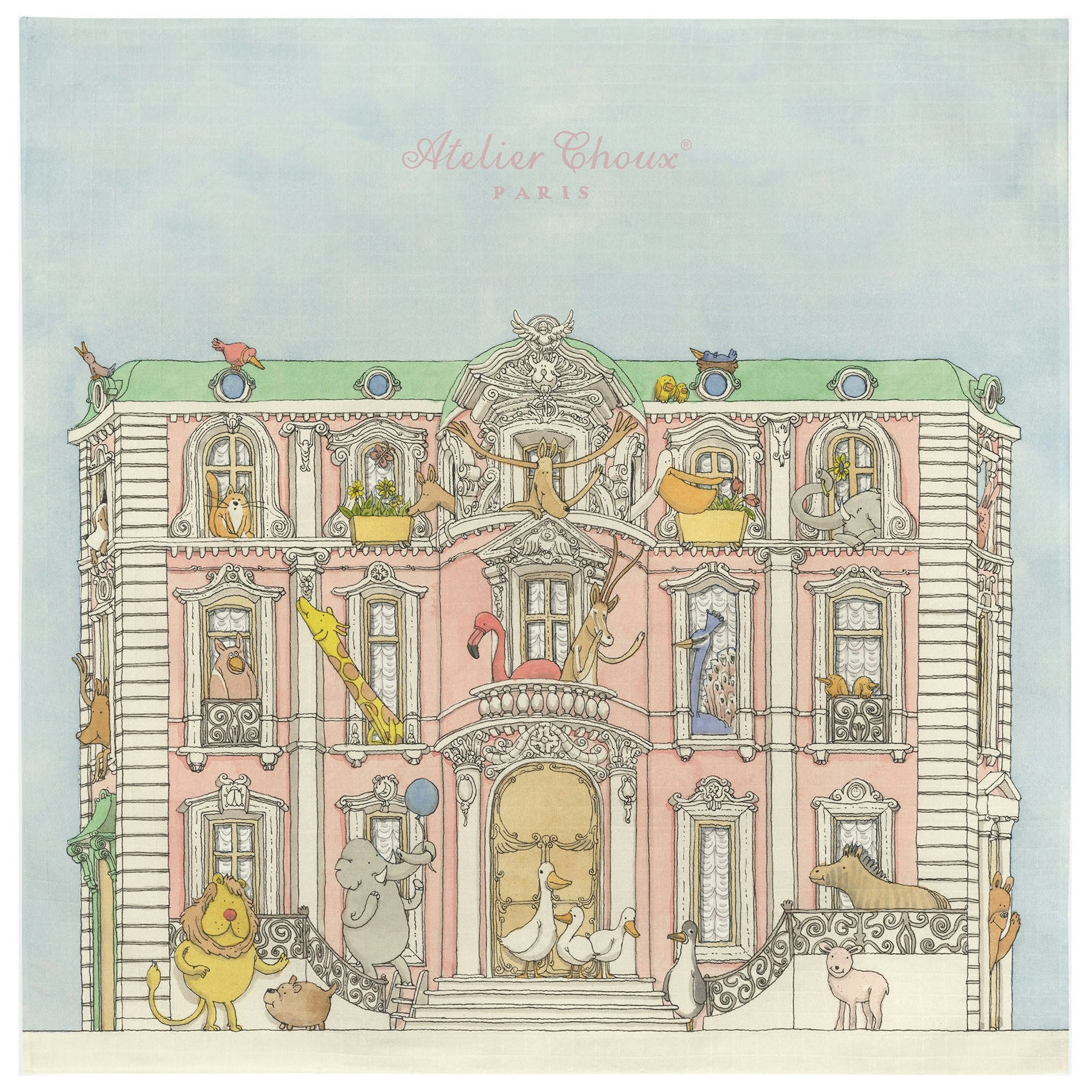 The illustration, spanning the entire 100cm x 100cm square, features a charming townhouse facade facing Parc Monceau in Paris. Adorable animals add color to your baby's moments.