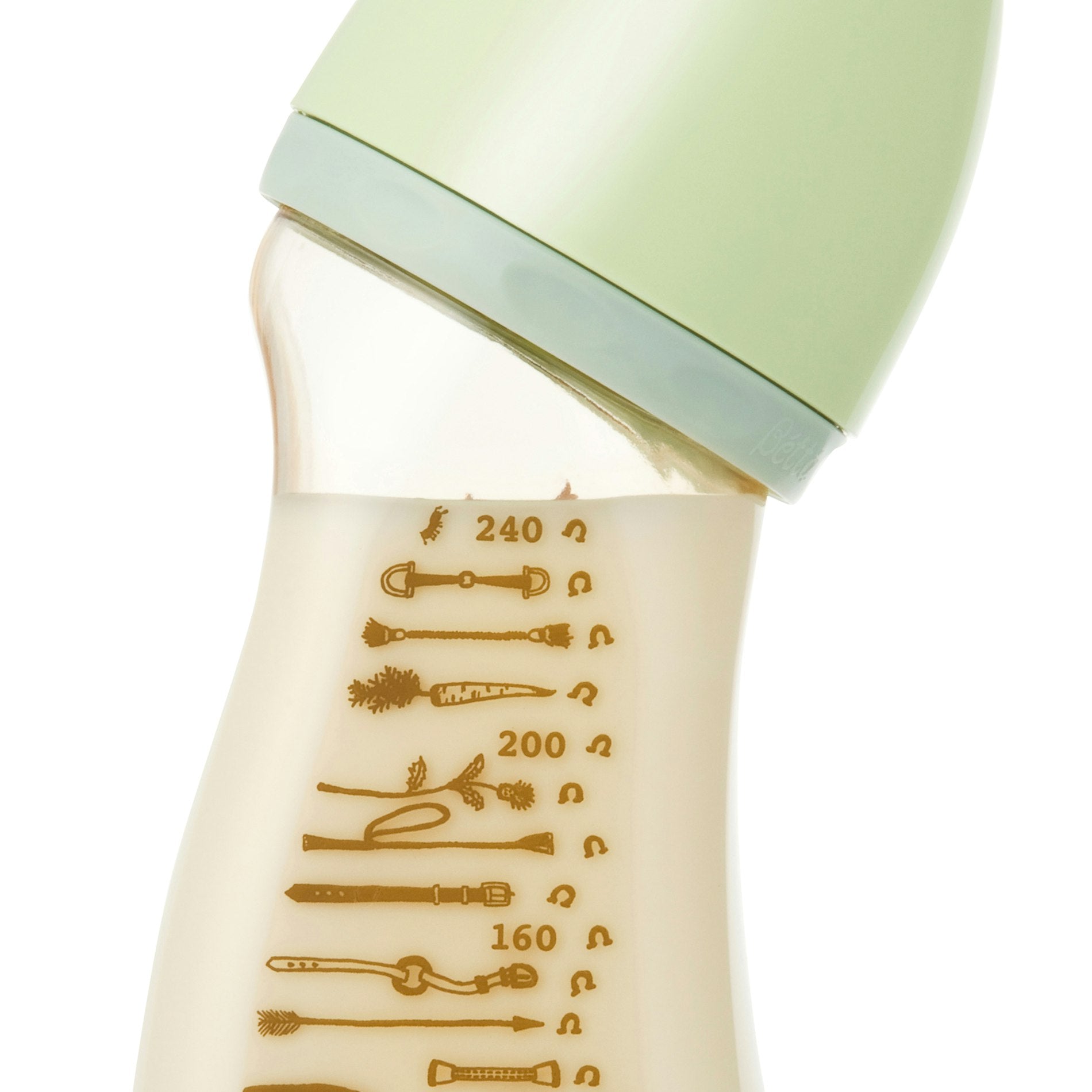 2026年の干支は午(うま)。2026年生まれの赤ちゃんに贈る、北欧調で牧歌的なやさしいデザインの哺乳びん。仲良く過ごす2頭の馬と幸せを運ぶ鳩が、豊かに愛される赤ちゃんの未来とみなさまの平和を願うボトルです。