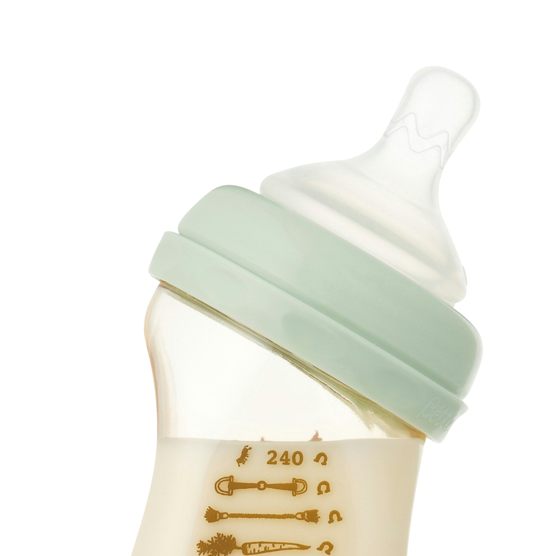 透明プラスチックとしては最高級の耐熱性と耐衝撃性のレベルであるPPSU。ボトル本体の耐熱温度は、なんと180℃。その強さゆえ医療機器などにも良く使われる、とてもポピュラーな素材。実績のある素材を採用することでより多くの安心をお届けしたい。そんなベッタの願いをこの素材に託しました。