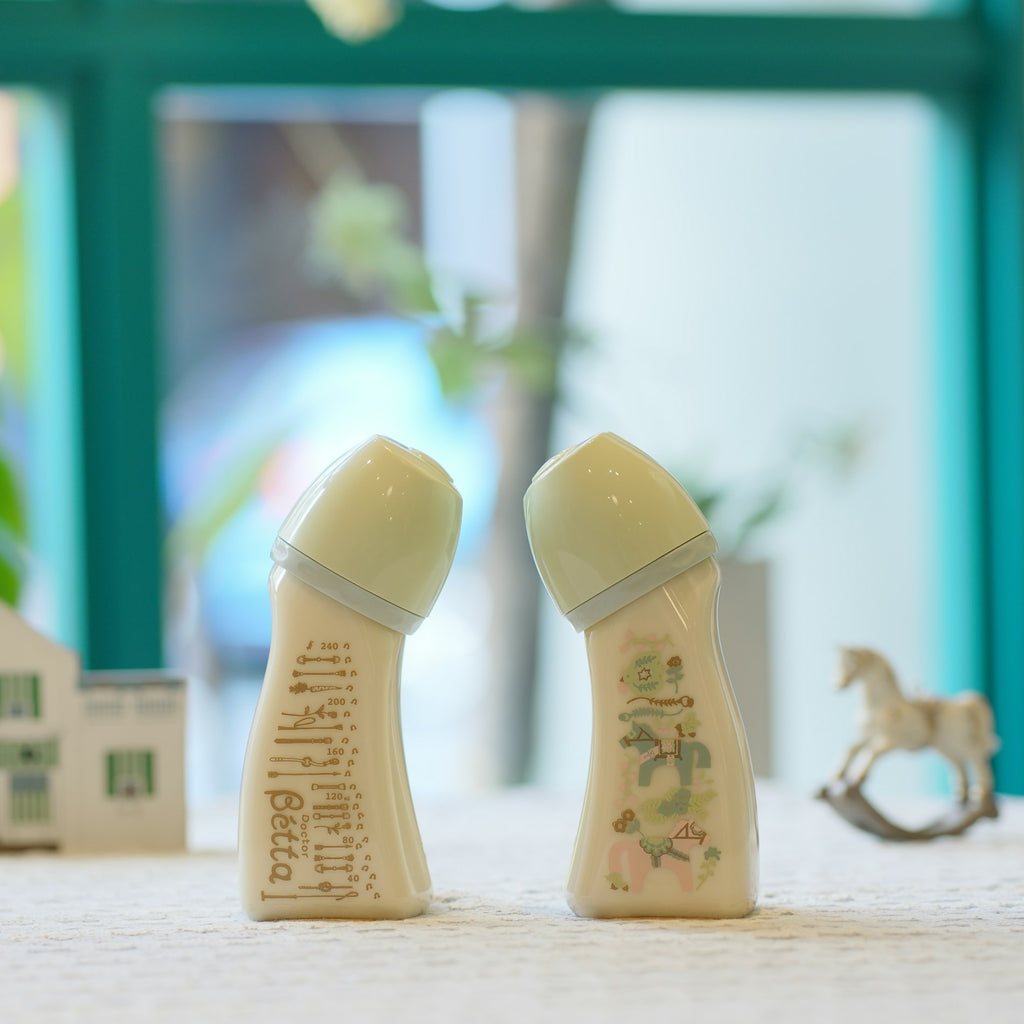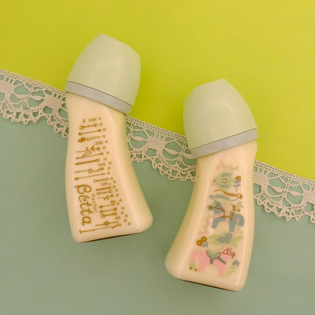 ドクターベッタの広口タイプは、ドクターベッタ哺乳びんの利点「お耳に安心+誤嚥を防ぐ+ゲップの軽減」に加え、洗いやすく、さらに調乳がしやすく、咥えた時の触感がママのおっぱいにより近い哺乳びんです。また、ぽっちゃりしたカタチは安定感があり倒れにくいため、調乳などの際は快適に使用することができます。