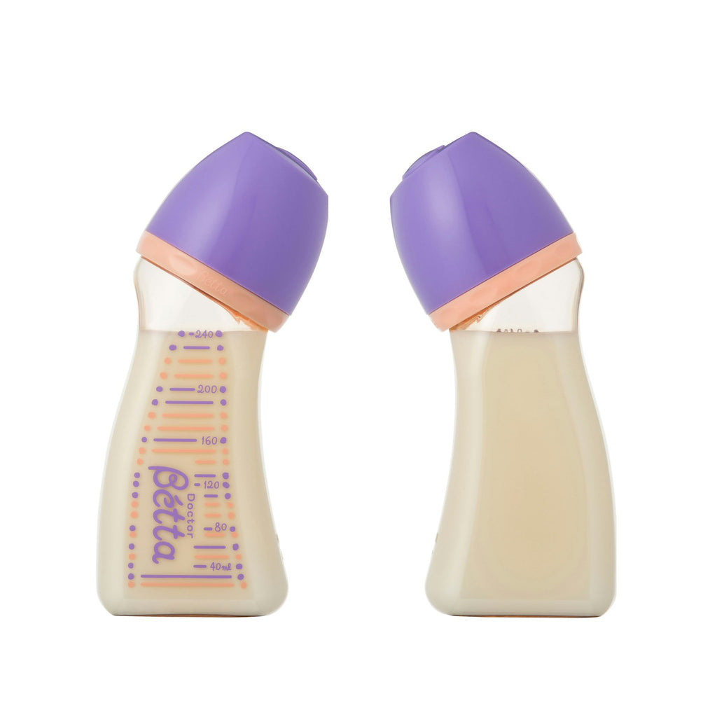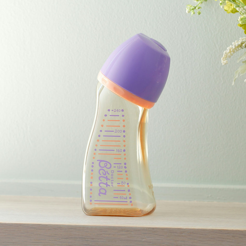 ドクターベッタの広口タイプは、ドクターベッタ哺乳びんの利点「お耳に安心+誤嚥を防ぐ+ゲップの軽減」に加え、洗いやすく、さらに調乳がしやすく、咥えた時の触感がママのおっぱいにより近い哺乳びんです。また、ぽっちゃりしたカタチは安定感があり倒れにくいため、調乳などの際は快適に使用することができます。
