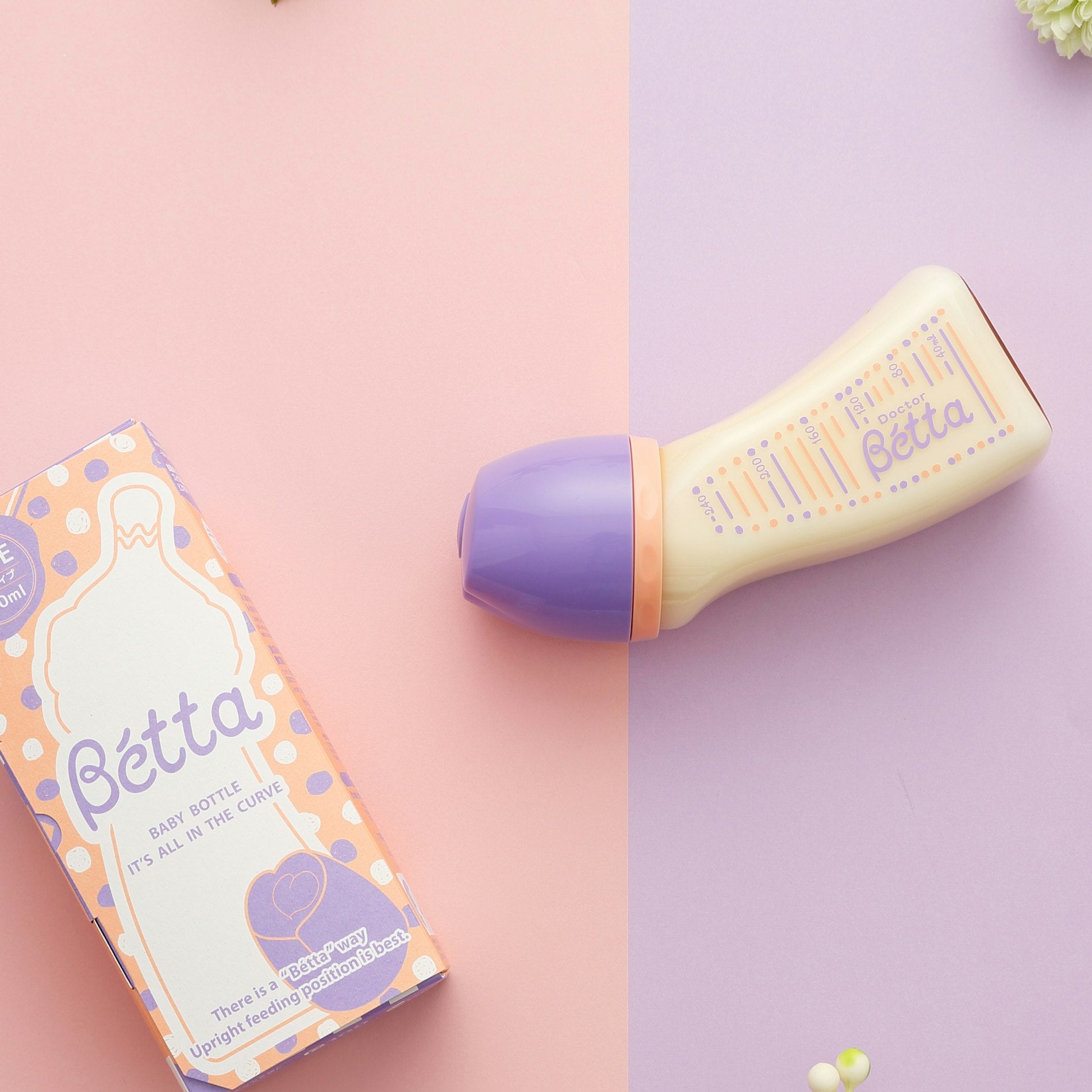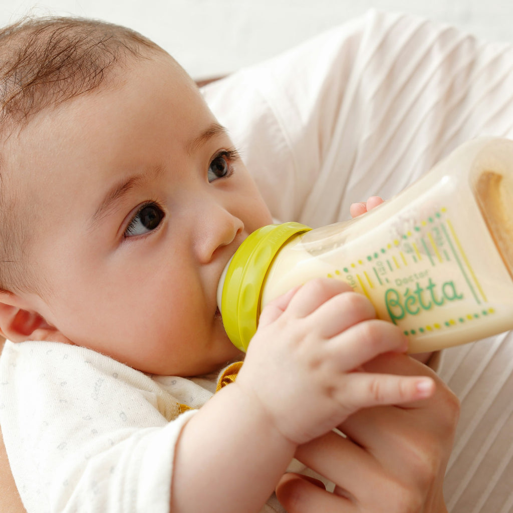 ドクターベッタ哺乳びんは、赤ちゃんがミルクを飲みやすいカタチ。小児科医が考案した独特の「カーブ」で母乳授乳と同じ上体を起こした自然な姿勢でミルクが飲めます。