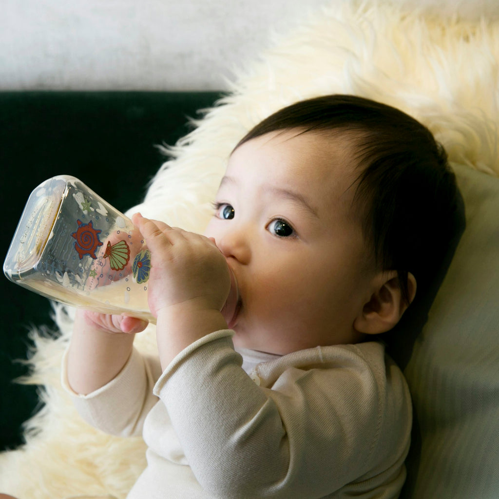 上体を起こした姿勢でミルクが飲めることで、耳管へのミルクの流れ込みを防ぎ、お耳にも安心。自然な姿勢でスムーズにミルクが食道へ流れて、誤嚥を防ぎます。カーブに沿って上へ上へ泡が逃げ、空気の飲み込みを減らしゲップを軽減します。 「母乳と同じ授乳姿勢」詳しくはこちら →