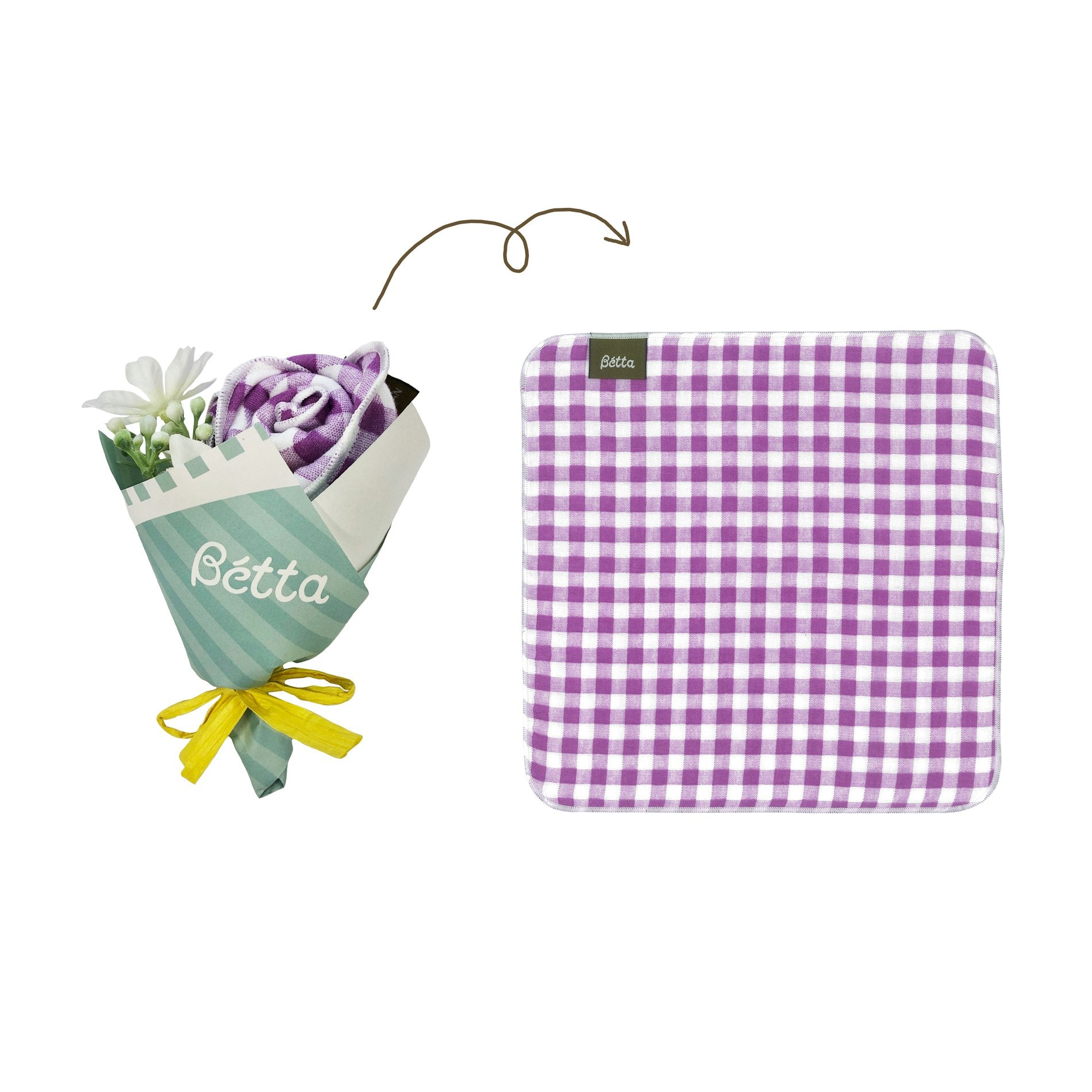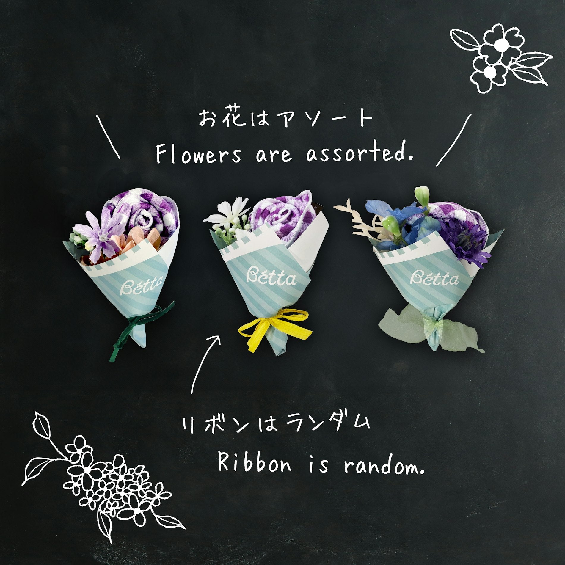 ベッタで人気の「ふんわりガーゼハンカチ」をブーケにアレンジしました。やさしい肌触りのガーゼが織りなす、華やかで可愛らしいミニブーケ。お祝い感がグッと高まります。お花はアソート、リボンはランダムのため、世界に一つだけのオリジナルブーケに。お手元にどんなブーケが届くのか、ぜひ楽しみにお待ちください。